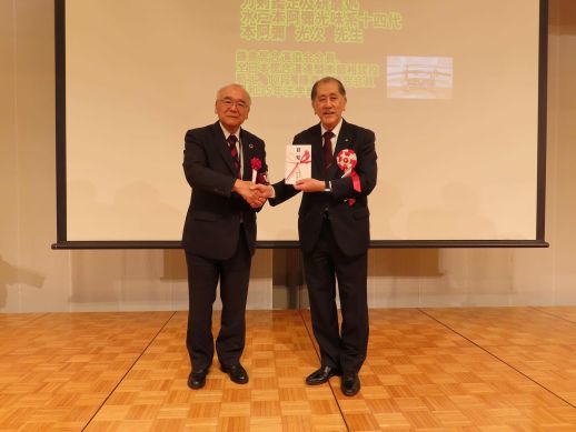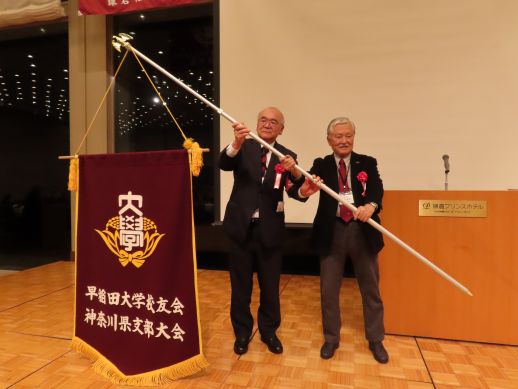 続いて県支部大会旗が鎌倉稲門会から次年度主管の小田原稲門会へと継承され、同会・和田雅邦会長より力強い決意表明がなされました。