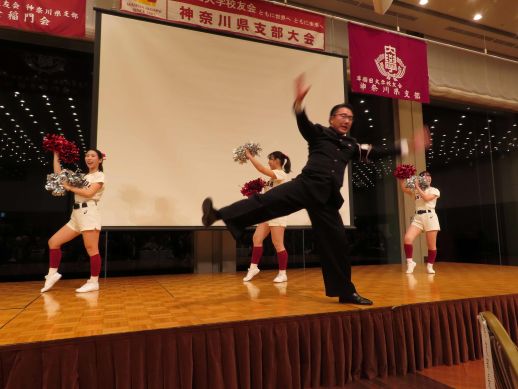 懇談も佳境に入るころ応援部登場、当日は早慶戦初日につき神宮球場から離れられない現役部員に代わり、リーダーOB2名、チアOG3名が駆け付け『紺碧の空』『早稲田の栄光』斉唱を見事リードし大いに盛り上がりました。