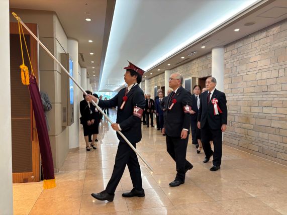 『早稲田の栄光』が流れる中、小林雅裕幹事(H08法)が掲げる県支部大会旗と先導役の兵藤芳朗会長(S50政経)に続き田中愛治総長を始めご来賓18名が整然と入場し県支部大会開会となりました。
