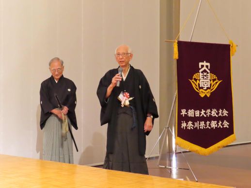 続いて鎌倉居合道協会会長・本阿彌光次範士十段(当会会員・S35法)より『日本刀とふれあう』と題しての講演、また高弟である今泉威夫八段(逗葉稲門会相談役・S41理工)による演武と、予定の時間を越えての熱演・迫力に水を打ったように静まり返る会場。